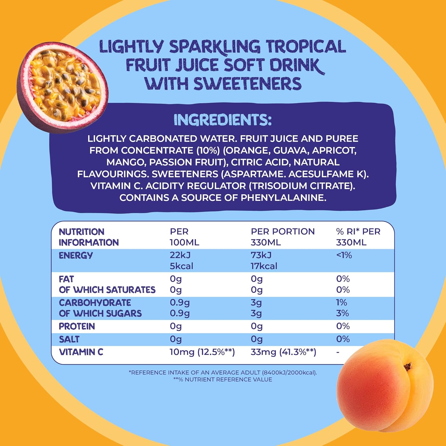 REFRESHING FIZZY DRINKS 24 PACK - Our lightly sparkling water fizzy pop cans provide maximum hydration and a blend of 10% real fruit and juice that give the same vibrant flavour cues of Orange, Guava, Apricot, Passion Fruit and Mango Juice with no added sugar and only 17 calories. Our canned drinks multipack 24 get you to samba with the taste of summer with added Vitamin C for maximum goodness!
