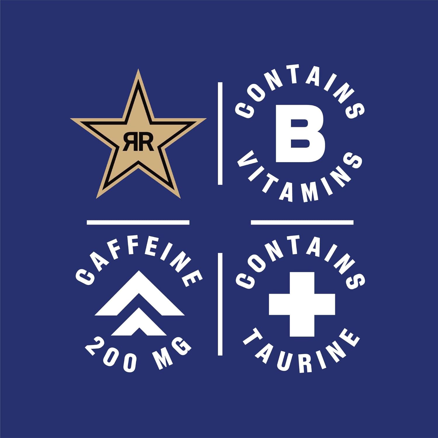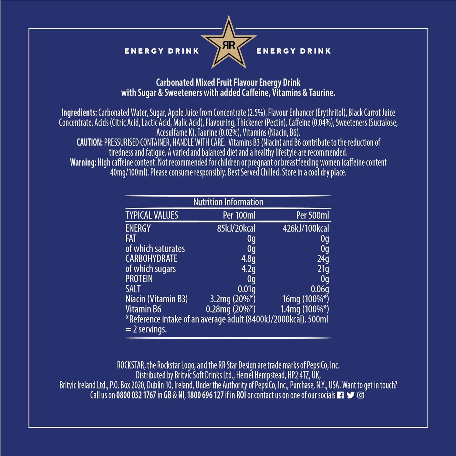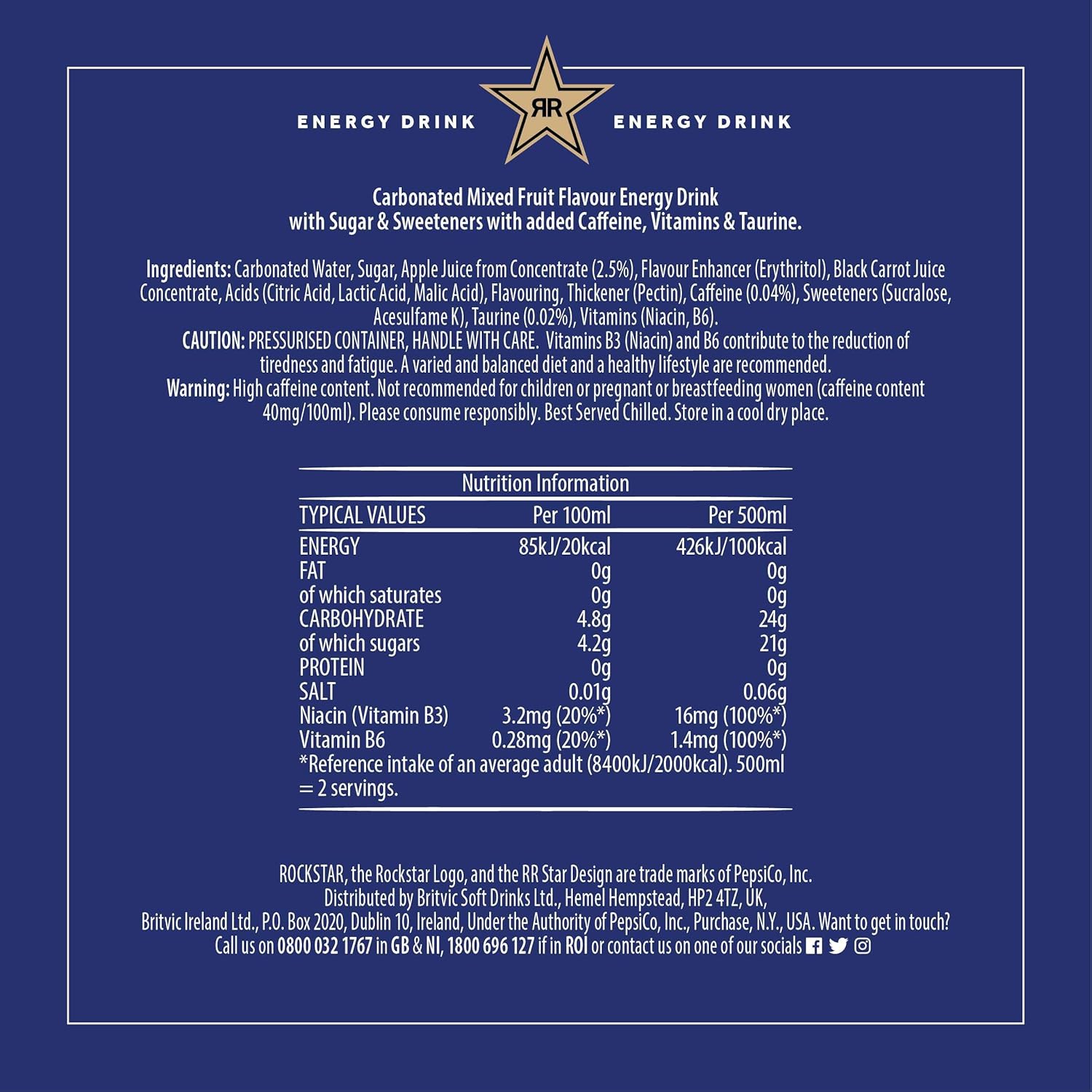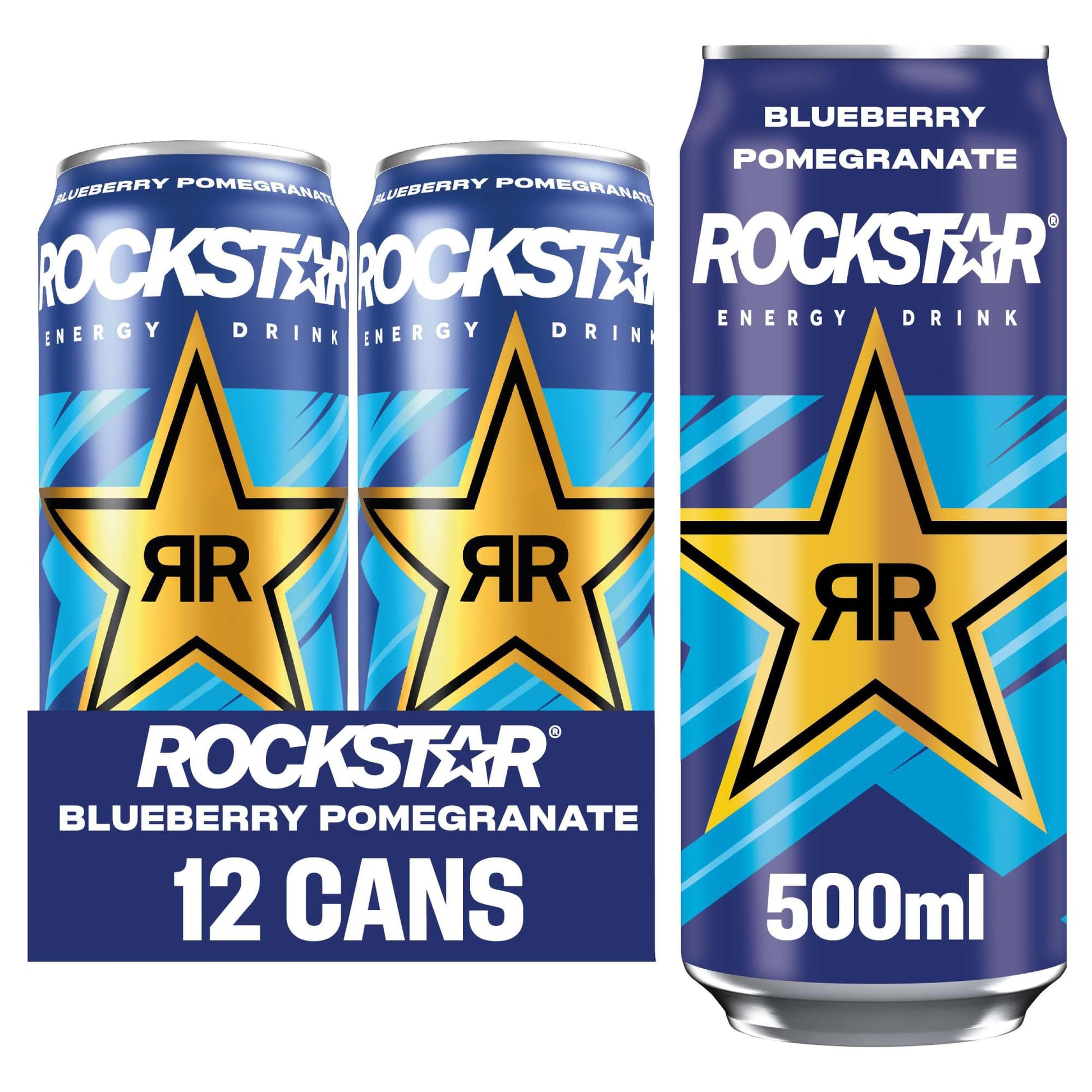 BLUEBERRY POMEGRANATE ACAI, Flavoured energy drink with added caffeine, taurine, guarana, ginseng, and vitamins (B3, B6, E). Rockstar is the original big can energy drink, and it is that West Coast American spirit that delivers a fun, positive and very cool energy drink that has explosive flavour