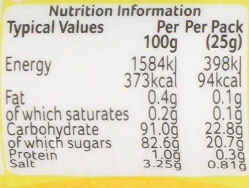 Nutritional Information Per 100g: Energy 1584 kj/373 kcal , fat 0.4 g of which saturates 0.2 g , Carbohydrates 91 g of which sugars 82.6 g , Fibre 0.7 g , Protein 1 g , Salt 3.25 g