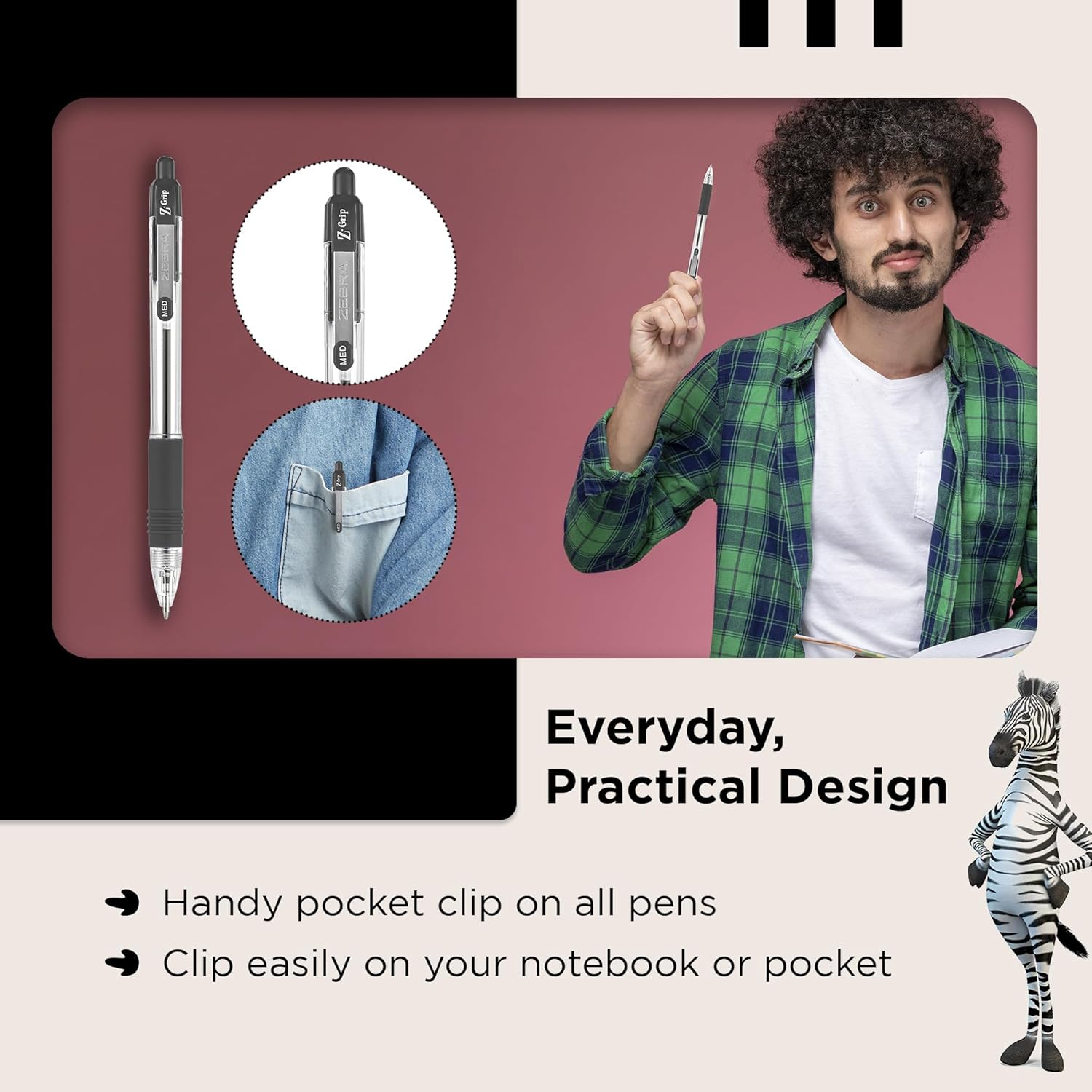 Zebra Pen Z Grip Black Ballpoint Pens with Pocket Clip 8pk, Retractable Black Ink Ballpoint Pens, Reliable Black Biro Pens Multipack for Everyday Use Design, New Pack Size 8pk