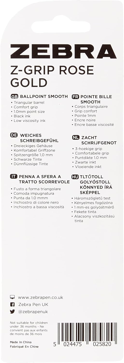 Zebra Pen Z Grip Black Pens Ballpoint, Super Trendy Rose Gold Ballpoint Pens With Triangular Barrel, Black Ink, Reliable Black Biro Multipack For Everyday Use - Medium Point, 3 pk